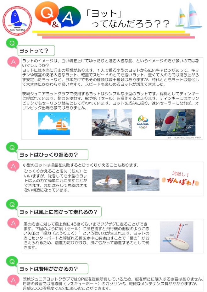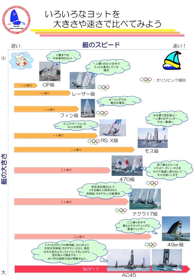 外国ではこうしたジュニア向けヨットを“Character Building Sport” と呼び、子供たちの知力・体力・情緒面の向上に大きな貢献をするもの として位置づけられ、国際レースに参加する事により世界の子供達との 交流を通じて、国際性豊かな子供ができる事が期待されます。