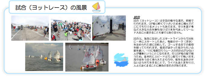 このヨットの特徴は強風下でも強い安定性が保たれ、容易に操船できる事で、ヨットの入門艇として世界中で高い評価を得ております。100ヶ国、15万人以上の子供たちに普及し、日本でも現在、約4000艇が活動し全日本OP級ヨット選手権大会を初め、多くの大会が日本 各地で開催され、競技力の向上と人間形成に大いに役立っています。